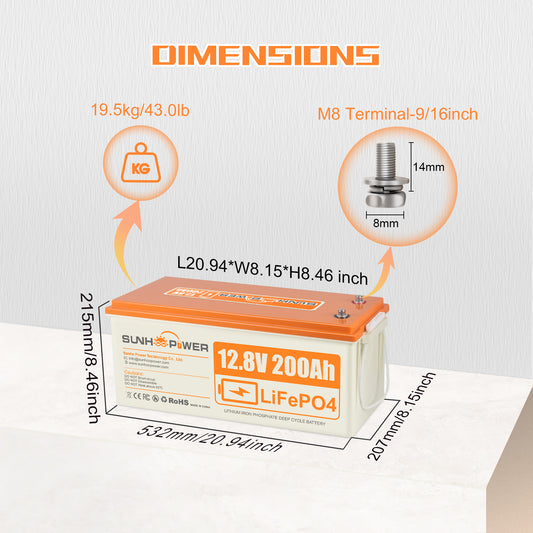SUNHOOPOWER 12V 200Ah LiFePO4-Akku, integriertes 100A BMS, 2560Wh Energie
