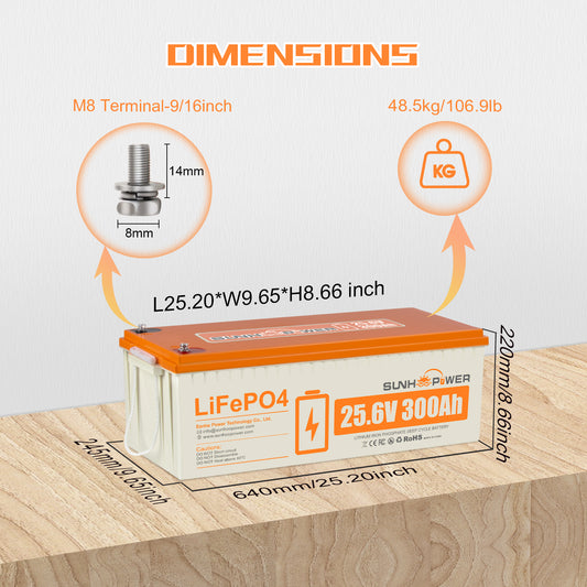 SUNHOOPOWER 24V 300Ah LiFePO4-Akku, integriertes 200A BMS, 7680Wh Energie