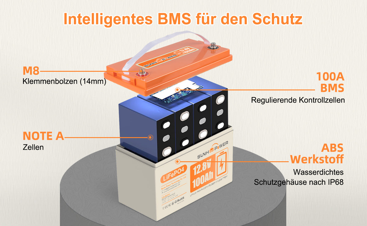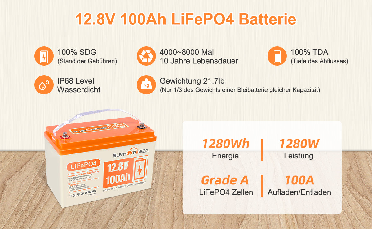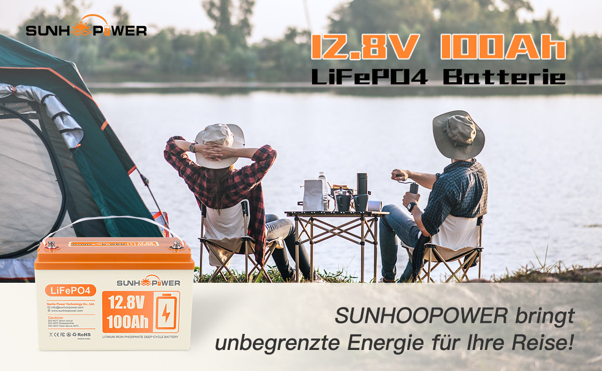 SUNHOOPOWER 12,8 V 100 Ah LiFePO4-Akku, integriertes 100 A BMS, 1280 Wh Energie