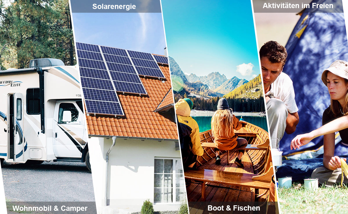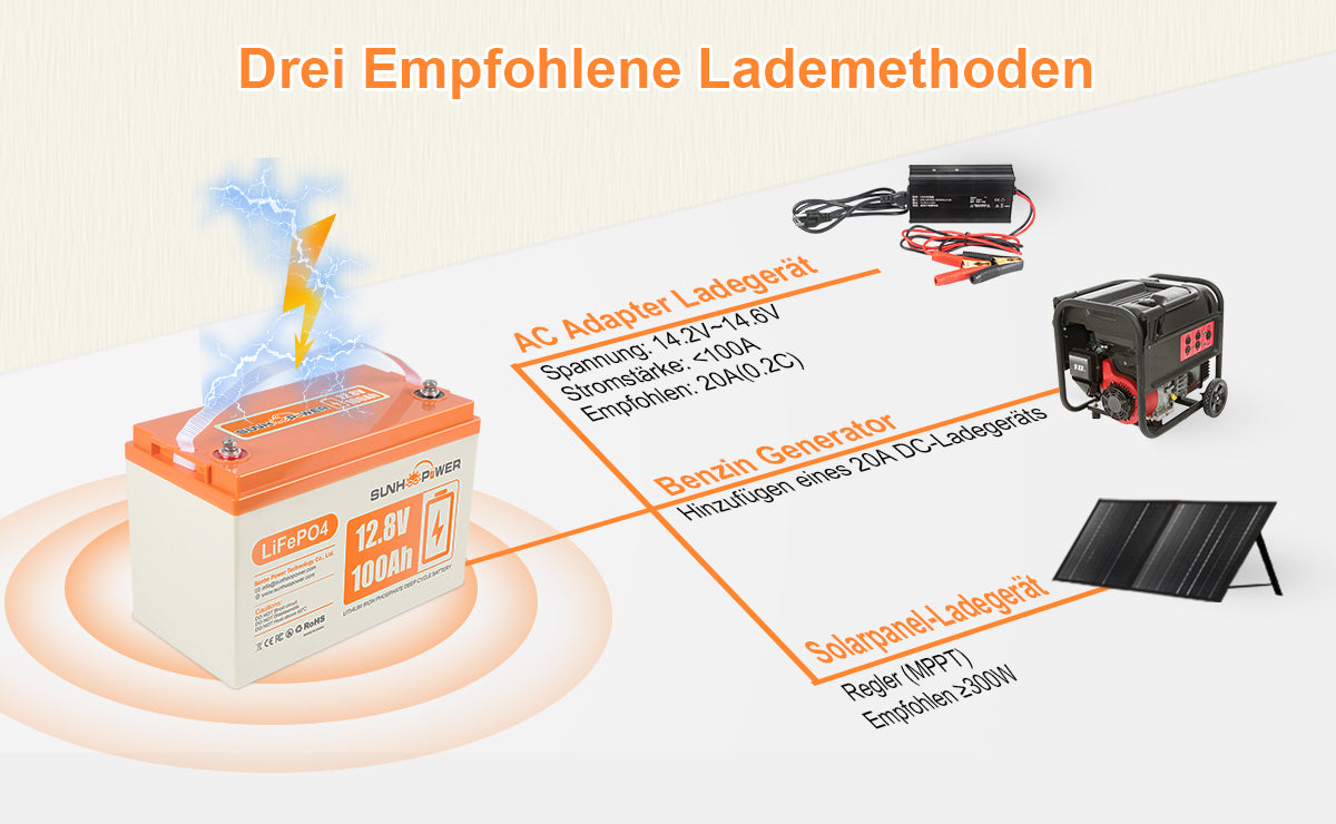 【WARNHINWEIS】 Der SUNHOOPOWER 12V 100Ah LiFePO4-Akku wird für die Verwendung mit Trolling-Motoren mit einem Gewicht von 30 bis 70 Pfund empfohlen. Bei LiFePO4-Batterien handelt es sich um Speicherbatterien und nicht um Starterbatterien. Wir raten davon ab, die Batterie als Starterbatterie oder zum Antrieb eines Golfwagens zu verwenden. Für weitere Informationen wenden Sie sich bitte an SUNHOOPOWER.