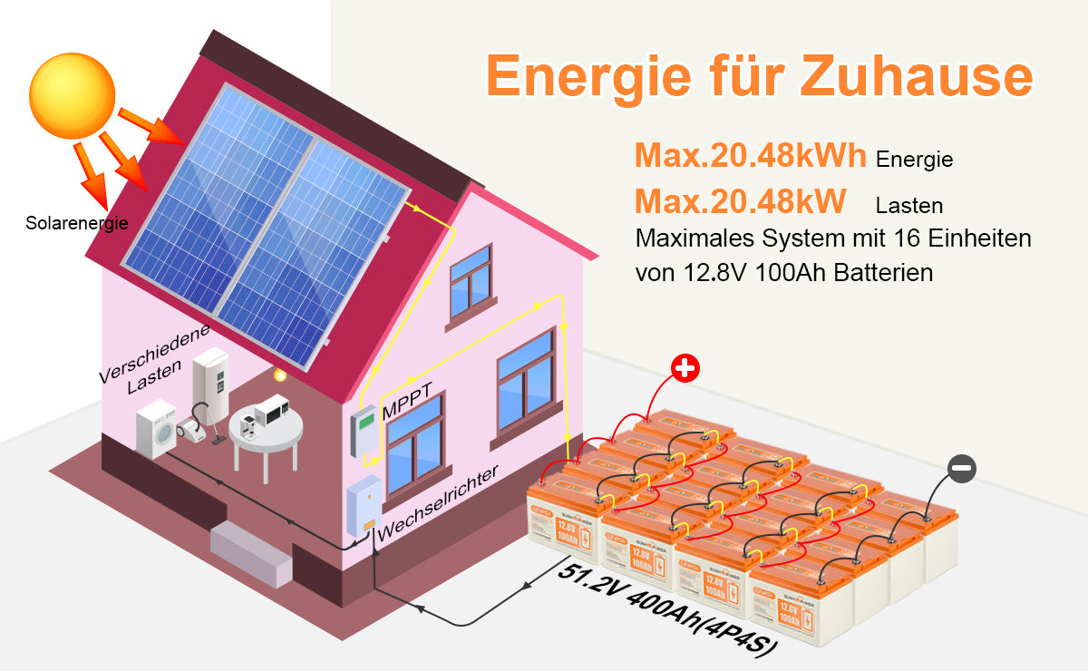 【Kapazitätserweiterung】SUNHOOPOWER 12V 100Ah Lithiumbatterien können für mehr Kapazität und Spannung parallel und in Reihe geschaltet werden. Maximale Reihenkapazität: Bis zu 4 identische Batterien können in Reihe geschaltet werden, Spannung bis zu 48 V. Parallel: Es können mehrere Batterien angeschlossen werden. Es wird empfohlen, nicht mehr als 4 Batterien parallel anzuschließen. Ermöglicht die Erweiterung auf 4S oder 4P für eine Kapazität von bis zu 400 Ah oder bis zu 48 V (51,2 V).