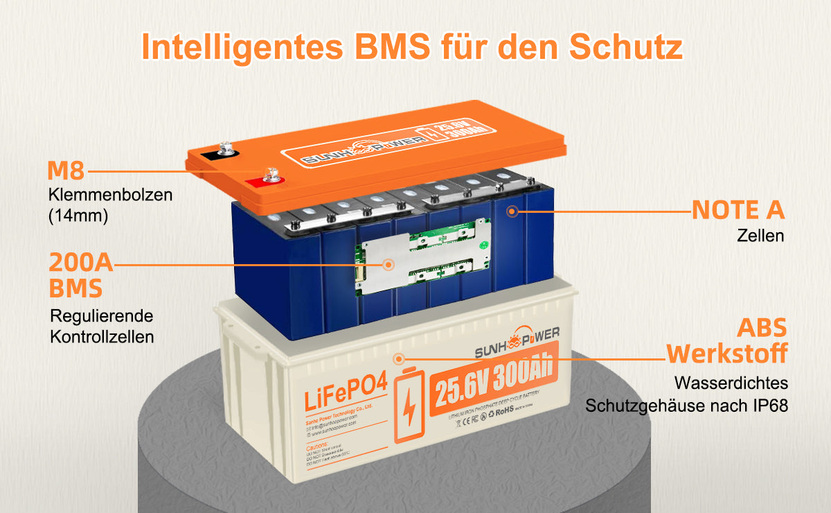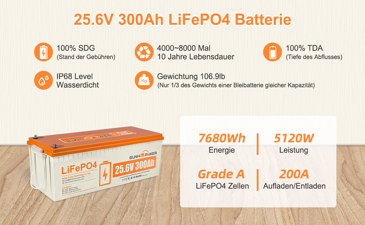 SUNHOOPOWER 24V 300Ah LiFePO4-Akku, integriertes 200A BMS, 7680Wh Energie