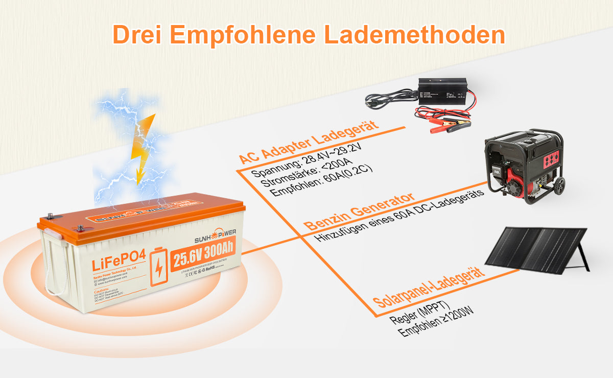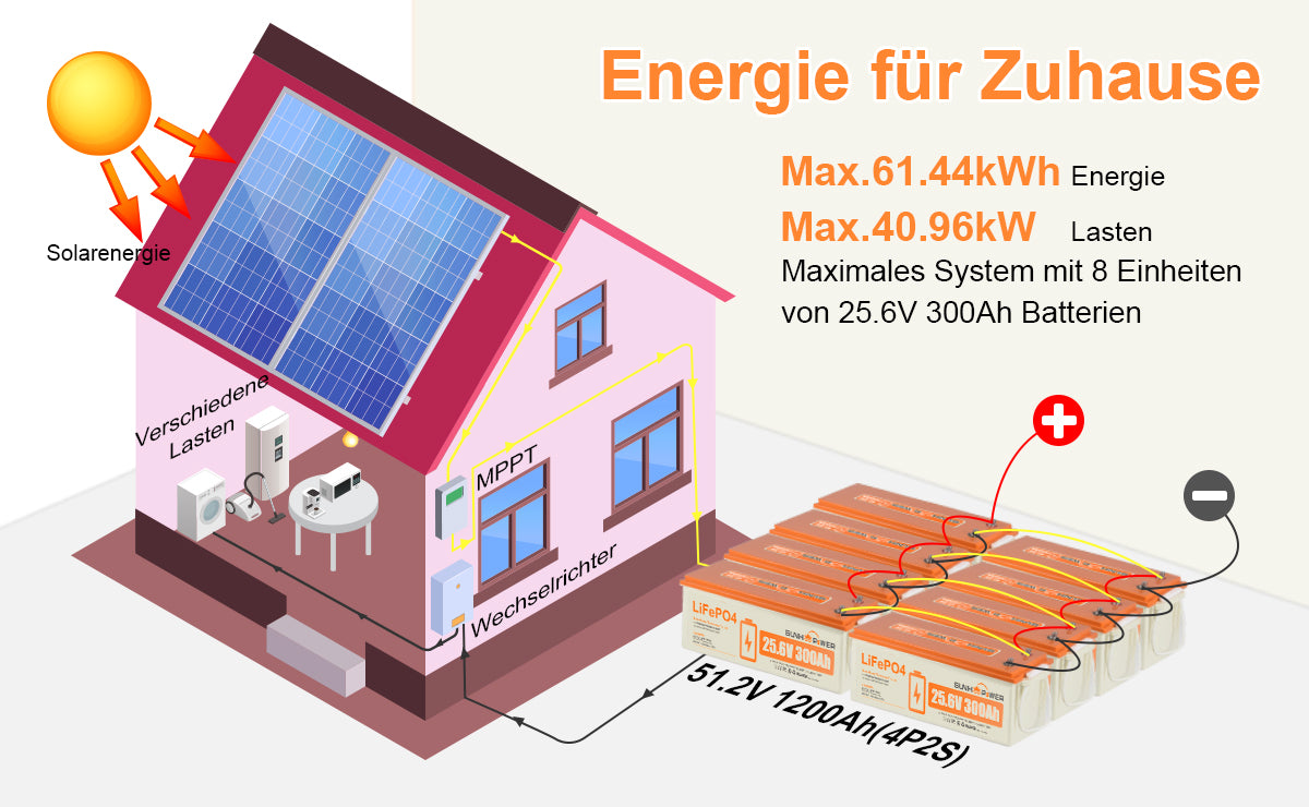 【Max. Kapazitätserweiterung um 61,44 kWh: SUNHOOPOWER 25,6 V 300 Ah Lithiumbatterien können für eine höhere Kapazität und Spannung parallel und in Reihe geschaltet werden. Maximale Serienkapazität: Bis zu 2 identische Batterien können in Reihe geschaltet werden, Spannung bis zu 48 V (51,2 V). Parallel: Es können mehrere Batterien angeschlossen werden. Es wird empfohlen, nicht mehr als 4 Batterien parallel anzuschließen. Ermöglicht die Erweiterung auf 2S oder 4P für eine Kapazität von bis zu 800 Ah oder bis zu 48 V (51,2 V). Der Max. Energie beträgt 61,44 kWh; Max. Die Lastleistung beträgt 40,96 kW.